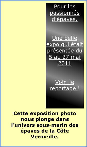 Suivez avec nous les actualités de la plongée en côte Vermeille: Événements Animations  ou reportage-découvertes Cliquez sur l’image pour lancer le reportage vidéo Expo les epaves de la cote vermeill Suivez le déroulement du concours photo, la plongée et les photographes en pleine chasse à l’image.